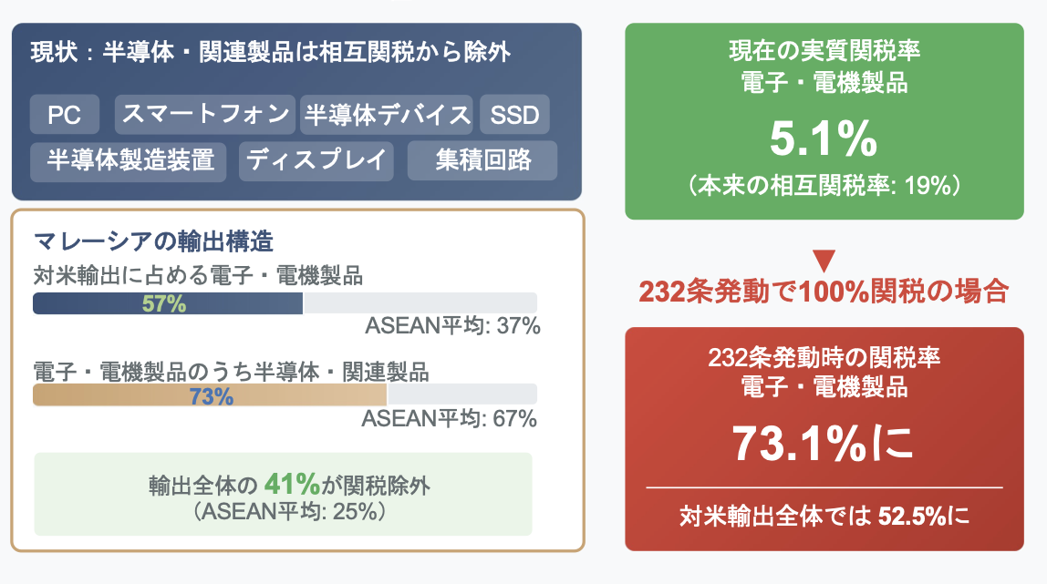 2024年の米国のマレーシアからの輸入額のうち、57%が電子製品(ASEAN平均37%)で、うち73%(同67%)が上記の定義による「半導体」となり、輸出全体の41%(同25%)が相互関税から除外されていることが分かります。いずれも、ASEAN平均よりも高く、マレーシアはASEANで相互関税からの半導体除外で最も恩恵を受けている国であることが分かります。