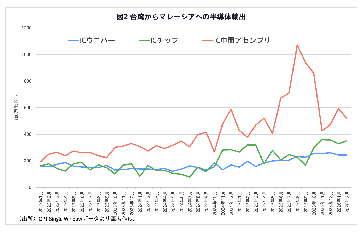 近年、台湾からマレーシアへの輸出が急増しているのはICチップとIC中間アセンブリですが、より大幅に増加しているのはIC中間アセンブリです。