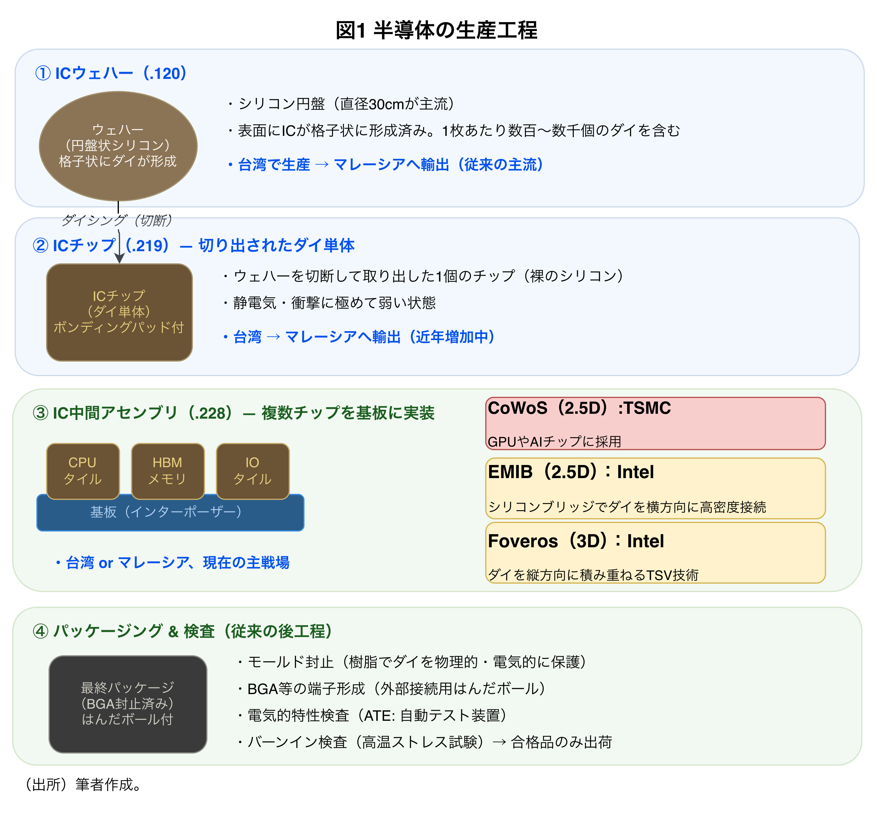 マレーシアの台湾からの半導体半製品の輸入が急増する一方で、どこまでをどちらの国の工程で行うかについては、水面下での綱引きがあります。これまで前工程の誘致こそが半導体産業の高度化への道とされていましたが、いつの間にか主戦場は、先進後工程となっているのです。